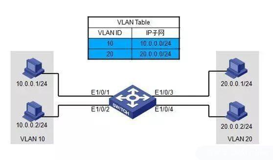 这种划分方法是根据子网划分,比如10.0.0.0/24属于VLAN10,20.0.0.0/24属于vlan20;
