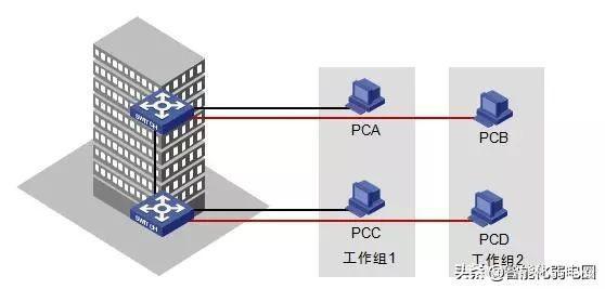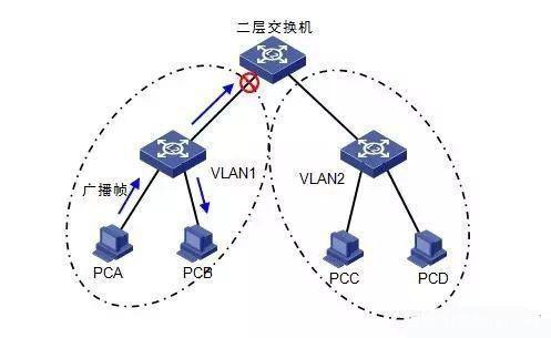 二层交换机使用VLAN(虚拟局域网)隔离广播,用来减小广播域范围。这样的话,不同VLAN之间是无法进行通信的,假设PCA发送一个广播帧,只会在VLAN1之间传播并不会传播到VLAN2,这样既限制了广播域的范围,又保证了VLAN2的安全性。
