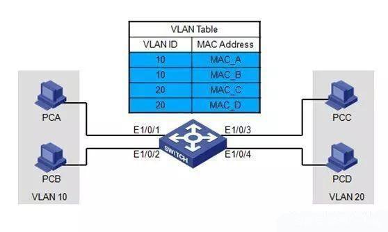 基于MAC地址的VLAN就是在划分VLAN的时候根据MAC地址划分VLAN,比如将PCA和PCB的MAC地址划分在vlan10中,那么PCA和PCB就属于VLAN10,PCC和PCD同理。
