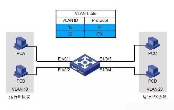 这种划分方法是指运行不同的协议划分到相同的VLAN中,比如PCA和PCB都运行的是IP协议,属于VLAN10,PCC和PCD同理。