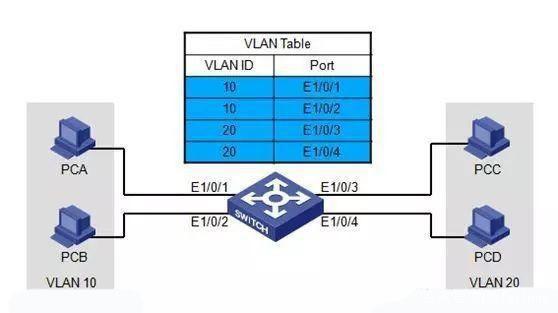 基于端口的VLAN划分方法是*常用的一种划分方法,就是一个或者几个端口属于一个VLAN,这个端口下面的用户也就属于该VLAN。假设以上图中,E1/0/1和E1/0/2属于VLAN10,E1/0/3和E1/0/4属于VLAN20,那么PCA和PCB也都都属于VLAN10,可以互相通信,PCC和PCD属于VLAN20,也可以互相通信。