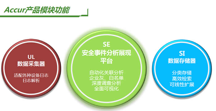 从功能模块来说,Accur由数据采集器UL、安全事件分析展现平台SE和数据存储器SI所组成,具有丰富的集成接口,可对Syslog、Webservice等不同格式数据进行采集、处理和加工,它具有30-300TB历史日志数据的存储能力,还可以根据需要进行线性扩展,其分析处理能力可以达到1万~5万EPS,从性能上可以达到实时监控、响应的需要。
